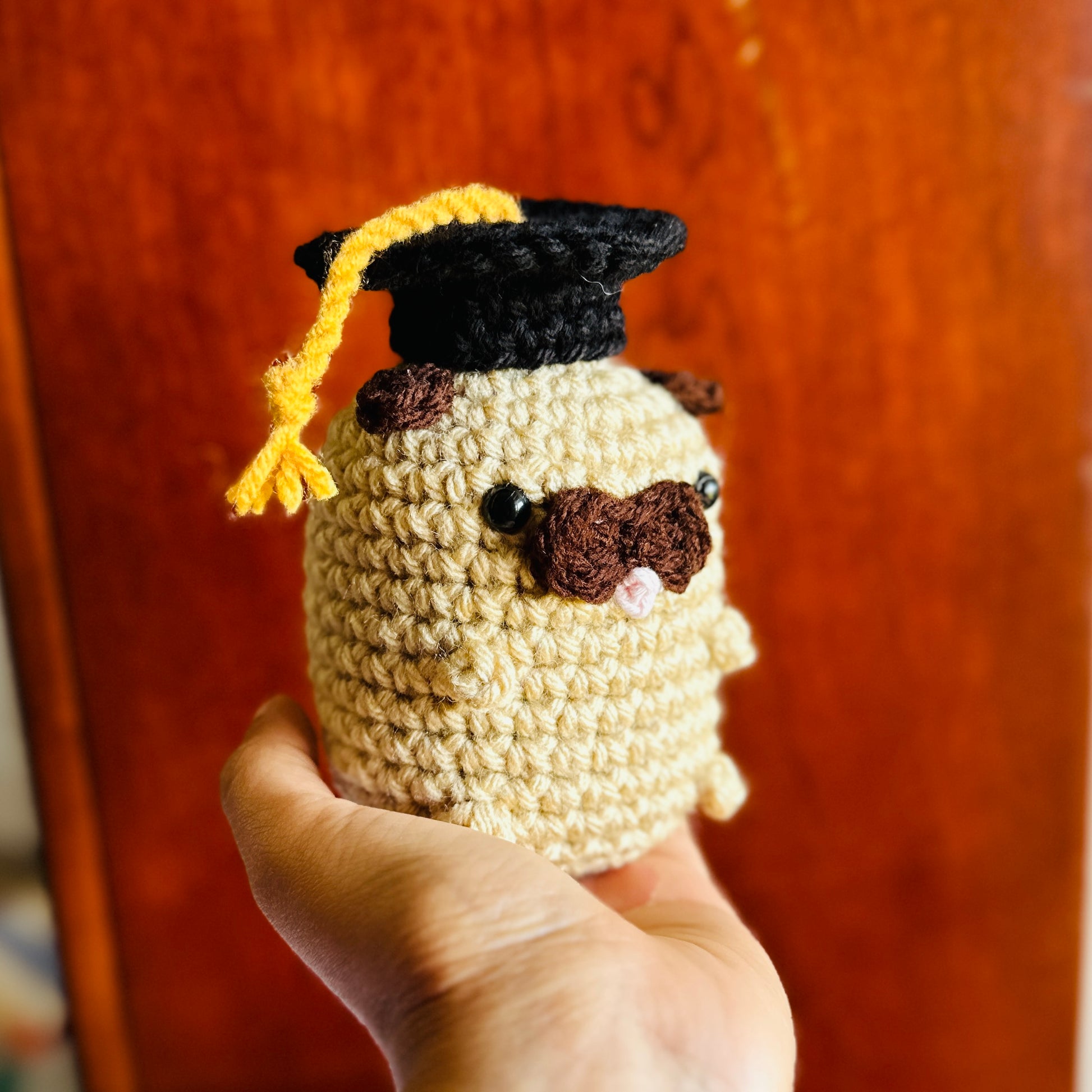 The potato pug is crochet handmade with love using 100% polyester yarn and safety eyes. The graduation cap is crochet handmade using acrylic yarn.
